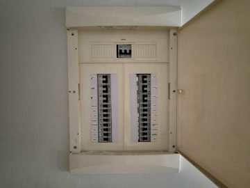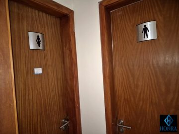 Ar condicionados, placas sinalizadoras nos ambientes e móveis na cozinha.
